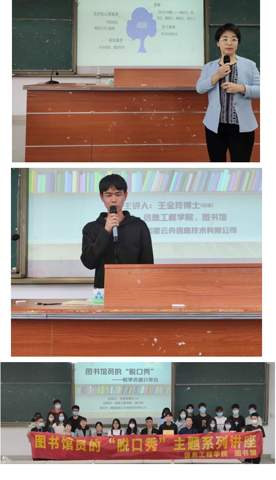在分享会上,王金玲博士分享了图书馆馆藏资源建设情况,着重介绍了图书馆公众号、中国知网和超星学习通等内容,并演示了图书馆公众号功能及网络电子资源检索技巧。随后,公司部分员工分享了图书阅读心得体会,赢得了同学们阵阵掌声。分享会最后,校图书馆馆长林琼老师和公司党委书记应永胜老师为“书香信工”第一季阅读达人进行表彰并颁发荣誉证书。